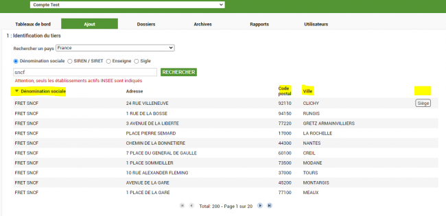 Je peux lancer ma recherche par le nom du Tiers (ou une partie du nom) , par l'identifiant du Tiers (le siret ou le siren) , le nom de l'enseigne ou le sigle (le code TVA ou le DUNS pour les étrangers quand je dispose de l'option) en cherchant par le nom
