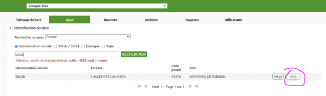 Si le Tiers est déjà présent dans mon compte , je verrai l'indication "déjà suivi"