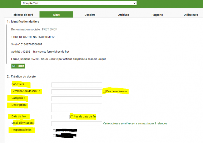 Si le Tiers que je souhaite mettre en suivi est déjà présent sur mon compte, le code Tiers sera renseigné par défaut (un seul code Tiers possible pour un siret)
