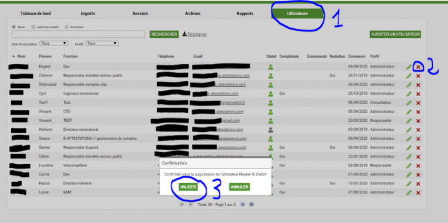 Lors de départ de collaborateurs du service ou de l'entreprise, il est important de désactiver leur accès. Pour désactiver l'accès à e-Attestations d'un utilisateur, il faut avoir le statut "administrateur, se rendre dans l'onglet utilisateur, cliquer sur la croix rouge tout à droite du nom et valider la suppression: