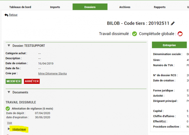 Je peux rapidement prendre connaissance de l'historique de dépôt en allant sur la fiche du tiers, je clique sur historique :