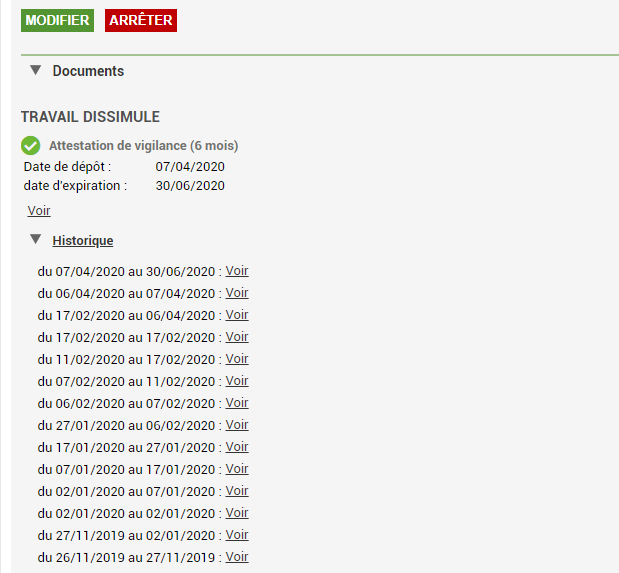 le bouton "historique" va me permettre de visualiser tous les documents déposés depuis le début de la mise en suivi (et non antérieurs à cette mise en suivi)