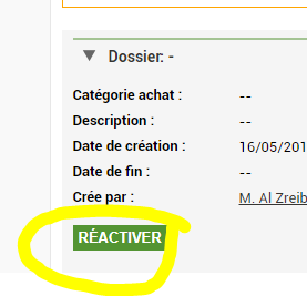 Il sera alors possible de réactiver le suivi de ce tiers si le bouton "réactiver" est bien vert . cela indique que le siret est toujours actif. ils era gris dans le cas contraire et le tiers ne pourra être réactivé